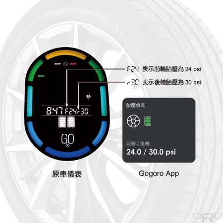 能提供機車騎士各個輪胎的胎壓、胎內溫度資訊,透過對胎壓、胎溫資訊的取得,可提供資訊予機車騎士去控制保持足夠的輪胎胎壓,除了可以增加騎乘機車的安全性外,並可減少因輪胎胎壓不足所額外產生的油秏。